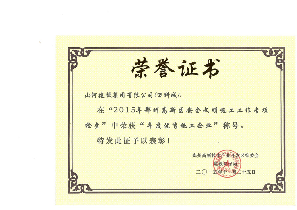 11月25日,在鄭州高新區(qū)安全文明施工專項(xiàng)檢查中,山河建設(shè)集團(tuán)有限公司榮獲由鄭州高新區(qū)管理會建設(shè)環(huán)保局授予的“年度優(yōu)秀施工企業(yè)”榮譽(yù)稱號。