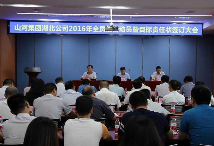7月4日上午,湖北公司2016年全員經(jīng)營動員暨目標責任狀簽訂大會在山河企業(yè)大廈30樓會議室隆重召開。會議旨在向湖北公司全體人員宣貫全員經(jīng)營理念及具體舉措,將全員經(jīng)營任務指標落實到團隊、部門。號召全體員工齊心協(xié)力,團結(jié)一心,確保圓滿完成全年經(jīng)營指標。集團公司董事長、建設(shè)版塊領(lǐng)導、湖北公司全體人員共計120余人出席本次會議。會議由集團公司常務副總經(jīng)理林中茂主持。