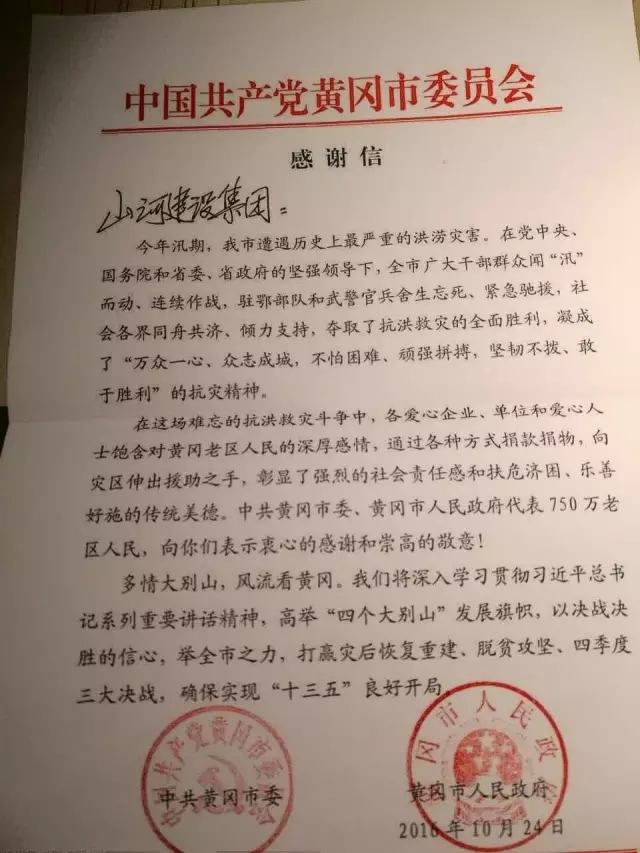 山河集團在這場難忘的抗洪救災(zāi)斗爭中,通過各種方式捐款捐物,伸出援助之手,其中飽含了對黃岡老區(qū)人民的深厚感情,更彰顯了強烈的社會責(zé)任感與作為“中國500強”的企業(yè)擔(dān)當(dāng)。