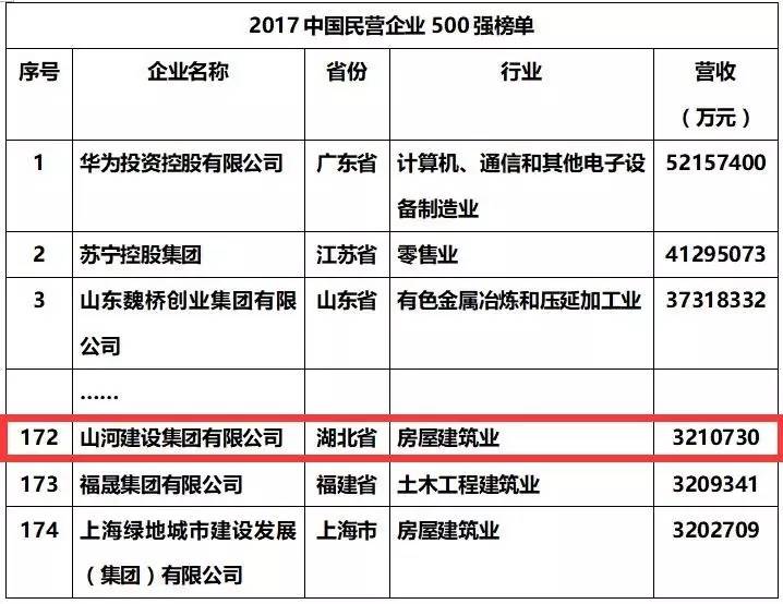 8月24日上午,在山東濟(jì)南舉行的“2017中國(guó)民營(yíng)企業(yè)500強(qiáng)發(fā)布暨民營(yíng)經(jīng)濟(jì)發(fā)展峰會(huì)”上,全國(guó)工商聯(lián)發(fā)布了“2017中國(guó)民營(yíng)企業(yè)500強(qiáng)榜單”,山河集團(tuán)以2016年?duì)I收總額321億元,名列“2017中國(guó)民營(yíng)企業(yè)500強(qiáng)”第172位。同時(shí),在“2016年民營(yíng)企業(yè)建筑業(yè)前20家”中,位列第10位。