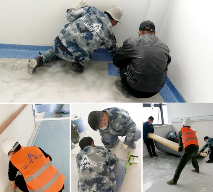 施工現(xiàn)場(chǎng),多類(lèi)工種各司其職,搶抓建設(shè)。突擊隊(duì)到達(dá)后,承擔(dān)起醫(yī)院住院大樓的部分地面鋪裝任務(wù),需要鋪裝地板膠的面積約3600平方米。分配好工作任務(wù),大家立即投入到緊張的施工中,清潔地面、檢測(cè)地坪、預(yù)鋪裁割、上膠、滾壓,每一道工序都一絲不茍。時(shí)間緊、任務(wù)重,那就加班加點(diǎn),即使再苦再累,也要按照時(shí)間節(jié)點(diǎn)保質(zhì)保量完成施工目標(biāo),這是山河人一貫的作風(fēng)。