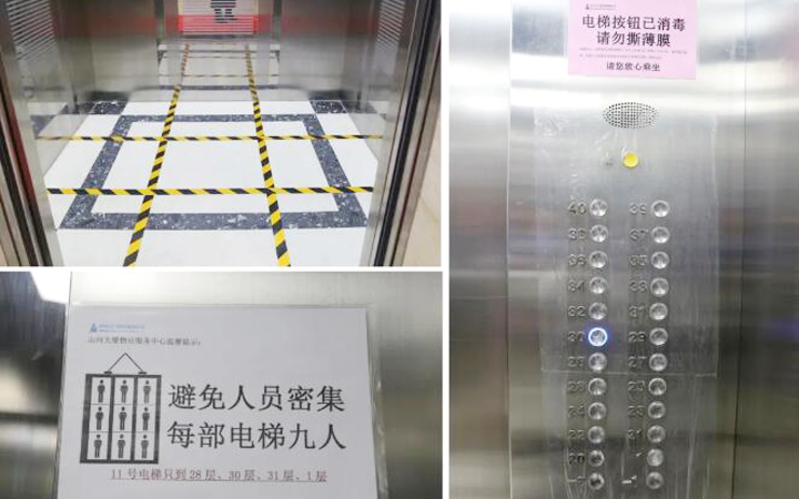 疫情期間,電梯實(shí)行“分區(qū)分層”管控,轎廂地面劃分為九宮格,由工作人員進(jìn)行引導(dǎo)。電梯轎廂每小時(shí)固定消毒一次,乘梯人員離開(kāi)后,轎廂內(nèi)安裝的紫外線消毒設(shè)備也會(huì)自動(dòng)進(jìn)行消毒,電梯按鍵保護(hù)膜每日更換,規(guī)避潛在的交叉感染可能。