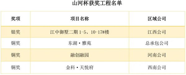 山河杯:“山河杯”是集團(tuán)工程質(zhì)量最高獎項,要求申報項目達(dá)到一定規(guī)模,完成竣工驗收備案,經(jīng)過一年使用沒有發(fā)現(xiàn)質(zhì)量缺陷和質(zhì)量隱患,獲得項目所在地優(yōu)質(zhì)結(jié)構(gòu)工程、優(yōu)質(zhì)建筑工程質(zhì)量獎項等。