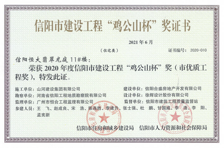 近日,由信陽市住房和城鄉(xiāng)建設局、信陽市人力資源和社會保障局聯(lián)合組織的“2020年度信陽市建設工程雞公山杯(市優(yōu)質(zhì)工程)評選”結(jié)果出爐,山河建設集團河南公司承建的信陽恒大翡翠龍庭11#樓工程榜上有名。