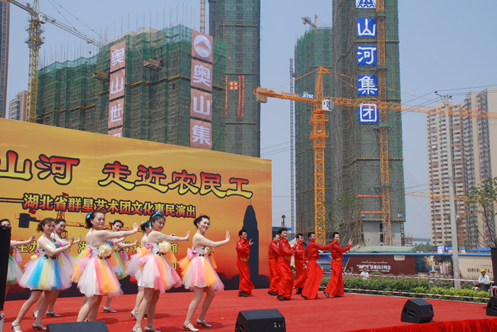 6月4日,山河集團(tuán)奧山世紀(jì)城項(xiàng)目施工現(xiàn)場鼓掌聲、歡笑聲、喝彩聲不斷,湖北省群星藝術(shù)團(tuán)帶來的惠民演出正在這里舉行。山河集團(tuán)黨委書記舒先厚,山河集團(tuán)湖北公司總經(jīng)理林中茂、副總經(jīng)理柯為正與四百多名農(nóng)民工一道觀看了演出。
