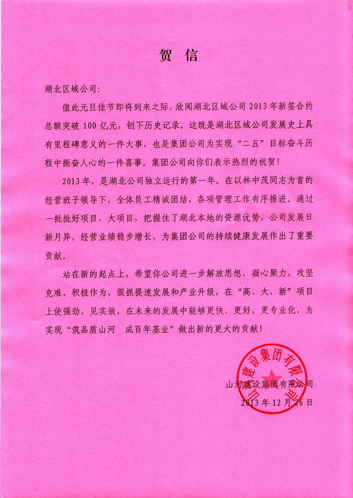 集團(tuán)公司特向湖北區(qū)域公司發(fā)來(lái)賀信表示祝賀,并期待湖北區(qū)域公司為實(shí)現(xiàn)“筑品質(zhì)山河 成百年基業(yè)”的企業(yè)愿景做出新的更大的貢獻(xiàn)!