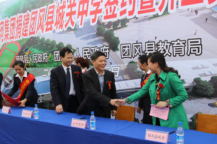 4月15日上午,山河集團(tuán)捐建團(tuán)風(fēng)縣城關(guān)中學(xué)簽約暨奠基開工儀式舉行,團(tuán)風(fēng)縣副縣長(zhǎng)黃菊花代表縣人民政府與山河集團(tuán)董事長(zhǎng)程理財(cái)簽訂了捐建協(xié)議書。
