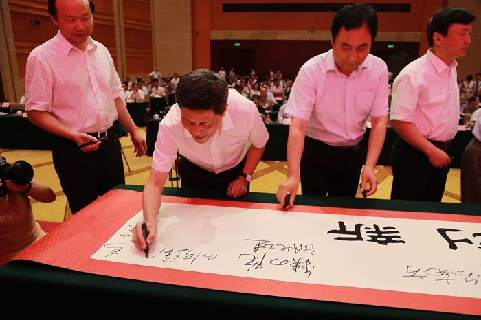 “維護(hù)建筑市場秩序,推行公平競爭,重合同,守信用,不做虛假宣傳,不逃避責(zé)任?!睍希珖舜蟠?、山河集團(tuán)董事長程理財(cái)代表省建筑產(chǎn)業(yè)聯(lián)盟企業(yè)作出鄭重承諾。隨后,產(chǎn)業(yè)聯(lián)盟成員單位現(xiàn)場簽名,共同發(fā)起“誠信守法 協(xié)同創(chuàng)新”倡議。