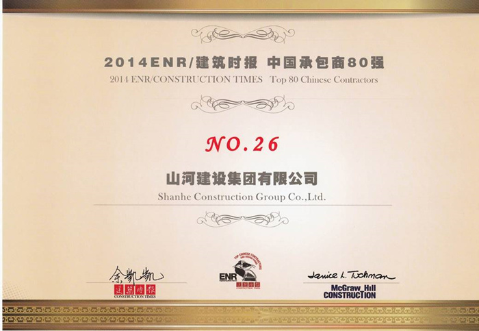 美國《工程新聞記錄》(ENR)和中國《建筑時報》兩家權威媒體共同主辦的2014年ENR/建筑時報“中國承包商80強和工程設計企業(yè)60強”排名于11月20日在北京揭榜。山河集團再次榜上有名,同比去年上升11位,排名列第26位,也是排行榜中湖北建筑企業(yè)第一名。