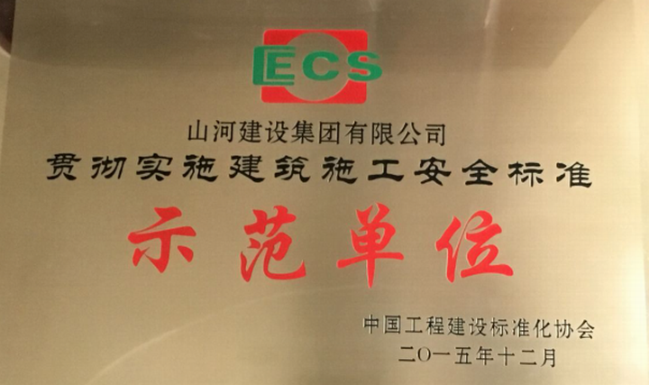 2015年12月,中國工程建設(shè)標(biāo)準(zhǔn)化協(xié)會施工安全專業(yè)委員會召開了貫徹實施建筑施工安全標(biāo)準(zhǔn)示范單位表彰大會,山河集團(tuán)榮獲“2015年度全國貫徹實施建筑施工安全標(biāo)準(zhǔn)示范單位”榮譽(yù)稱號。
