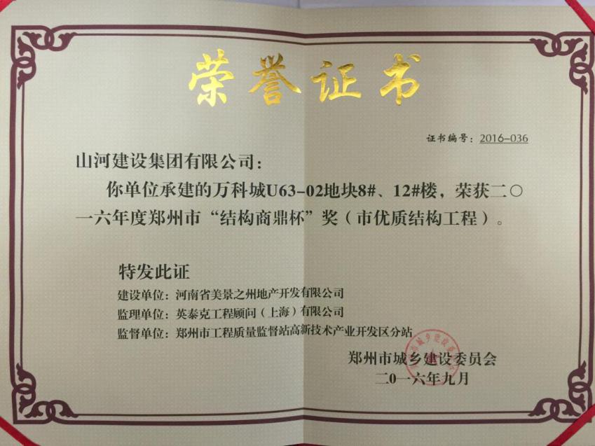 近日,從鄭州市城鄉(xiāng)建設(shè)委員會再次傳來喜訊,山河集團(tuán)河南公司承建的萬科城U63-02地塊的8#、12#樓榮獲2016年度鄭州市“結(jié)構(gòu)商鼎杯”(市優(yōu)質(zhì)結(jié)構(gòu)工程)獎。這是該項(xiàng)目繼2016年3月獲得“鄭州市建筑施工安全生產(chǎn)標(biāo)準(zhǔn)化示范項(xiàng)目”后,再獲殊榮。