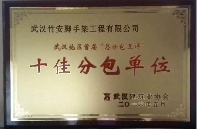 今日,武漢建筑業(yè)協(xié)會組織的武漢地區(qū)首屆總分包互評活動在光谷金盾大酒店舉行頒獎儀式,武漢竹安設(shè)備管理有限公司及控股子公司武漢竹安腳手架工程有限公司以其雄厚的技術(shù)實(shí)力和良好的聲譽(yù),雙 雙獲評“十佳分包單位”。