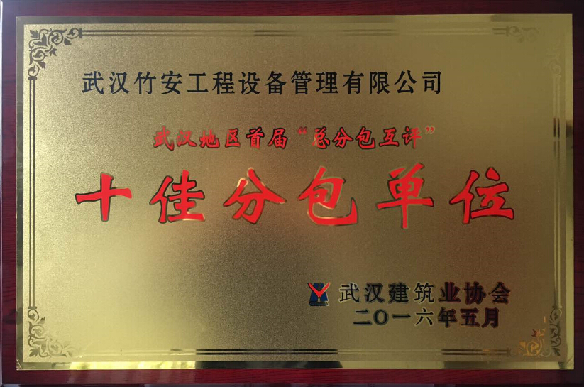 [竹安設(shè)備]竹安公司榮獲武漢地區(qū)首屆總分包互評“十佳分包單位”