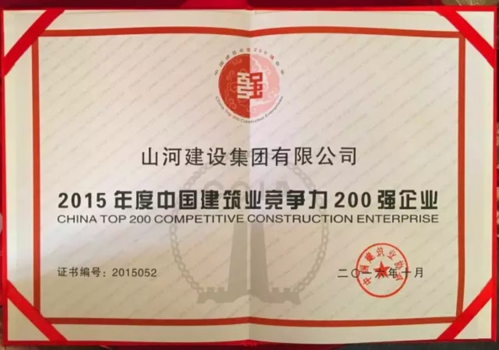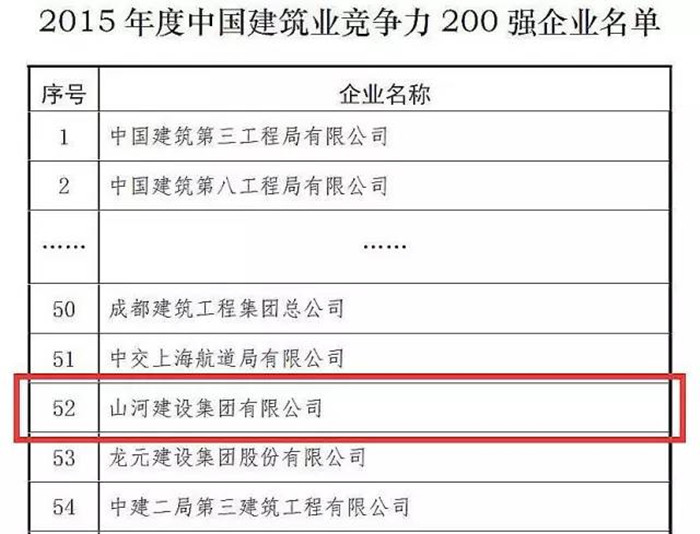 12月8日,中建協(xié)在廣西南寧發(fā)布2015年度中國(guó)建筑業(yè)競(jìng)爭(zhēng)力200強(qiáng)企業(yè),山河集團(tuán)在榜單中排名52位。