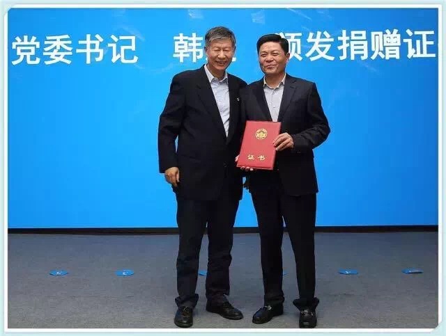▲武大黨委書記韓進為董事長程理財頒發(fā)捐贈證書