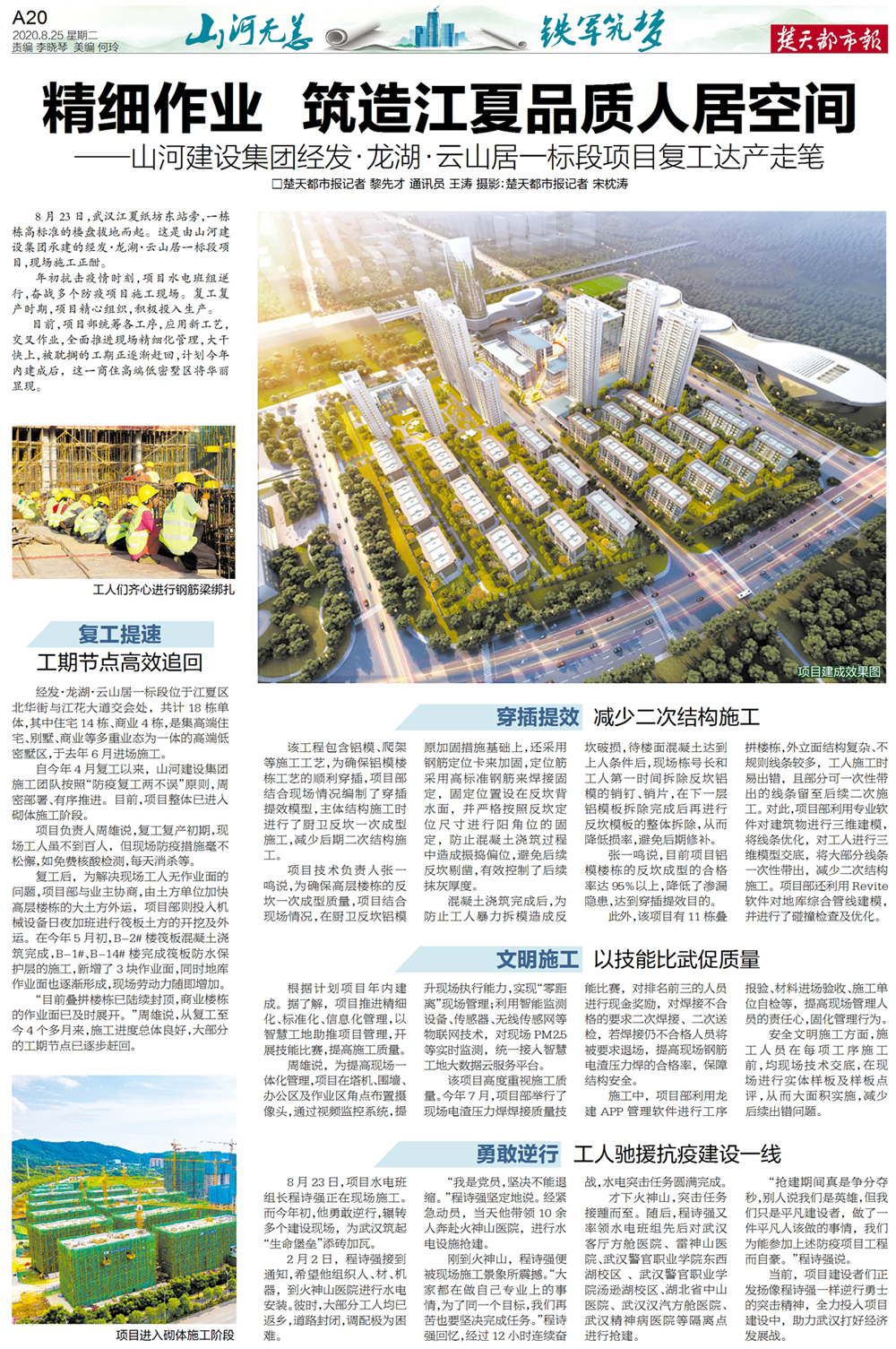 8月25日,《楚天都市報(bào)》“山河無恙 ?鐵軍筑夢(mèng)”特刊刊發(fā)了山河建設(shè)集團(tuán)項(xiàng)目管理公司經(jīng)發(fā)·龍湖·云山居一標(biāo)段項(xiàng)目復(fù)工達(dá)產(chǎn)的采訪報(bào)道。這是繼6月18日刊發(fā)湖北公司相關(guān)報(bào)道后,楚天都市報(bào)再次聚焦集團(tuán)建設(shè)一線。在疫后重振的關(guān)鍵時(shí)期,集團(tuán)各項(xiàng)目部正“火力全開”加快施工進(jìn)度,全力以赴推動(dòng)項(xiàng)目如期建成。