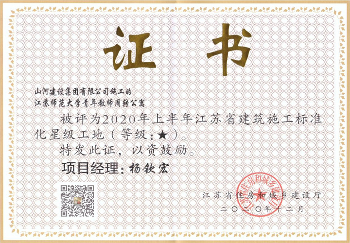 近日,從江蘇省住房和城鄉(xiāng)建設(shè)廳傳來喜訊,山河建設(shè)集團江蘇公司承建的江蘇師范大學青年教師周轉(zhuǎn)公寓工程被評為“2020年上半年江蘇省建筑施工標準化星級工地”,再添一項省級榮譽。