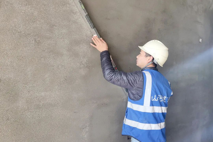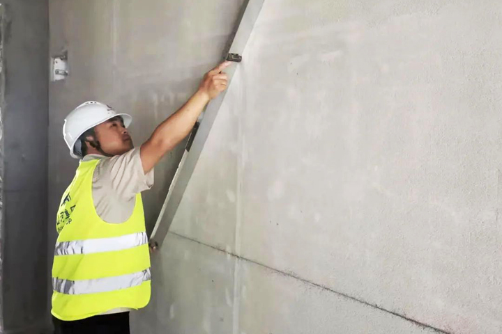 ▲遂川碧桂園項目抹灰班組工人進(jìn)行石膏抹灰沖筋