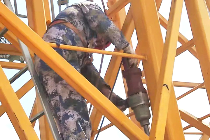 ▲定安牧嶼云天項目塔吊安拆工在做拆除塔吊前的準(zhǔn)備工作
