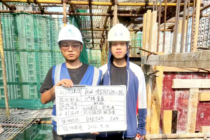 ▲江門市新城博富領(lǐng)會國際二期項目代表和監(jiān)理單位代表舉牌驗收